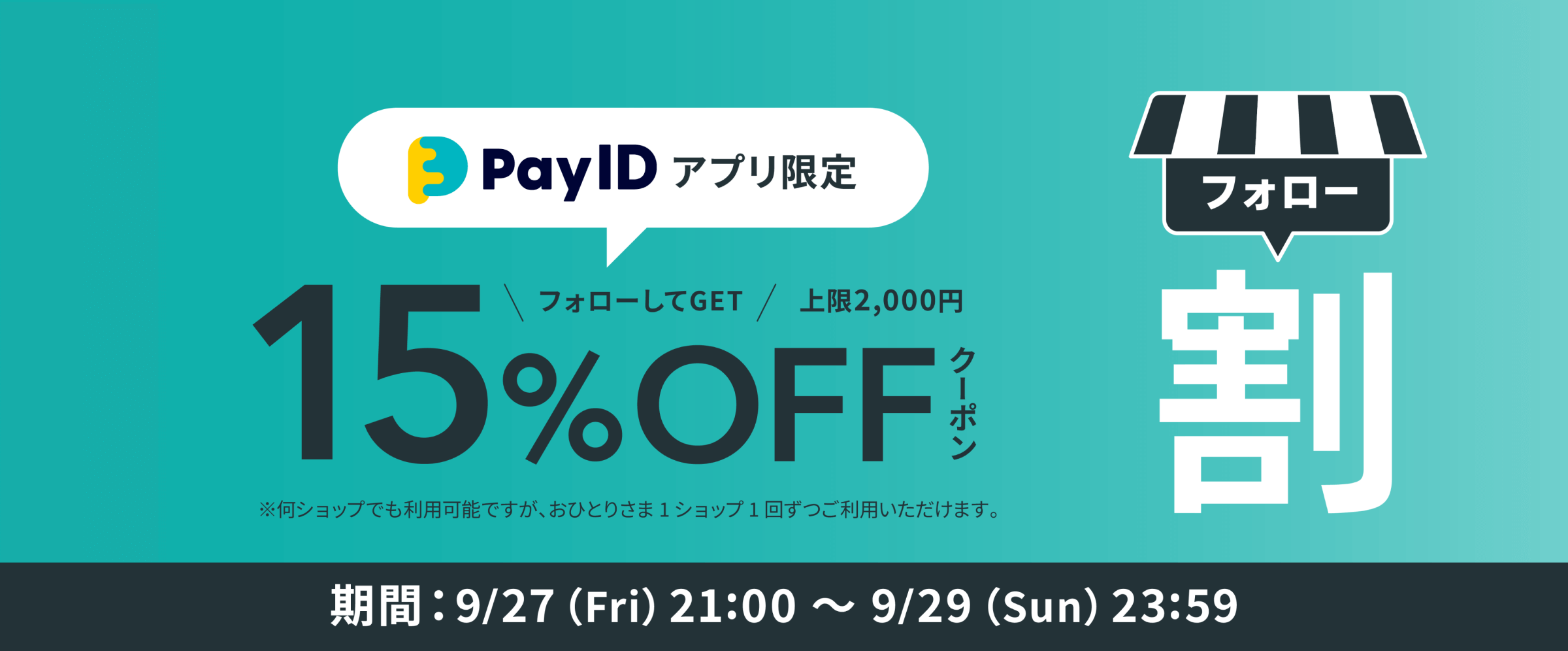 【9/27〜29】【Pay IDアプリ限定】フォロー割キャンペーンショッピングアプリ「Pay ID」でのお買い物で、ショップをフォローすれば15%OFFクーポン(上限2,000円)がその場でお使いいただけます!クーポンコード:...