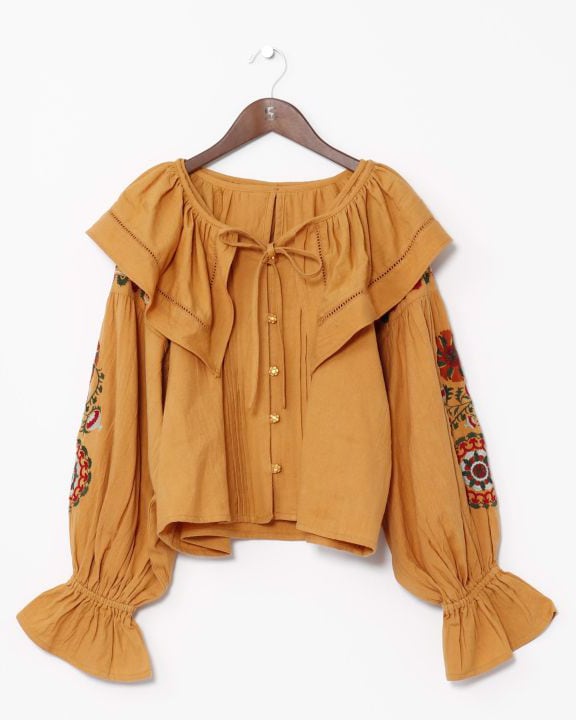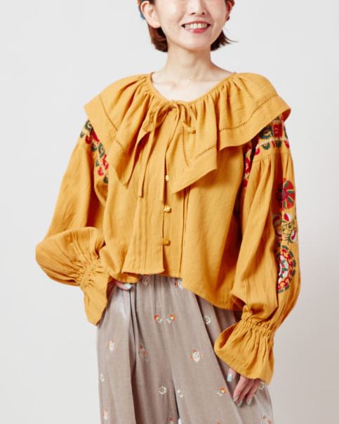 身頃のピンタックで上品さを、肩から袖にかけての刺しゅうで華やかさをプラス。