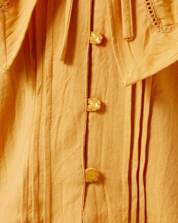 レースを施したキャンディースリーブの袖と、大きな襟が魅力的なブラウスです。