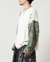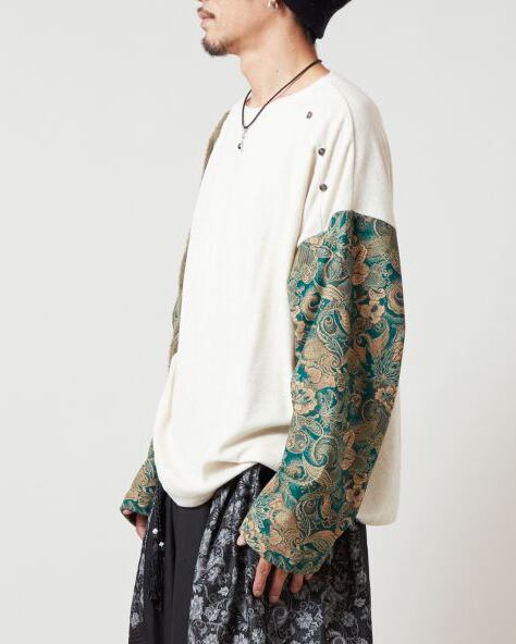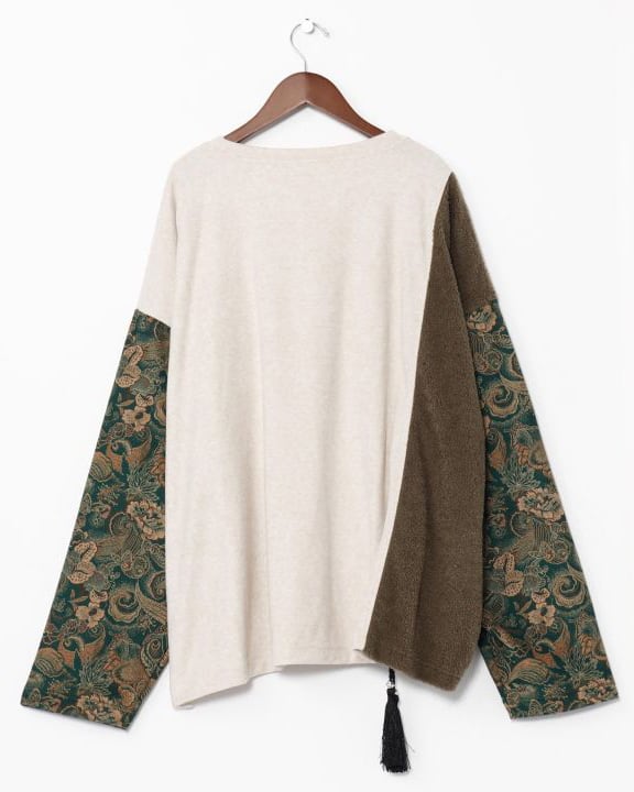 オリエンタルな花柄をあしらった柄生地と、肌触りのいいパイル地、ボアを組み合わせた、大胆なパッチワークが魅力のメンズトップス。