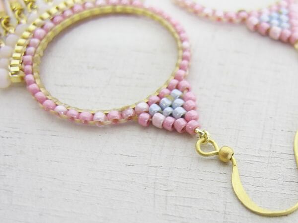 フリンジの根本には桜の花びらのような白に近いようなうすピンク、先には明るめのブルーのカットビーズがキラキラと輝きます。