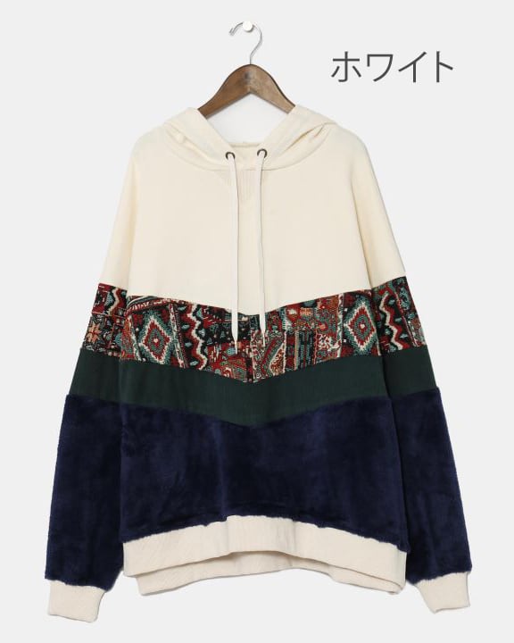裏毛、ゴブラン、ファー、コーデュロイを組み合わせたパッチワークが楽しいパーカーです。